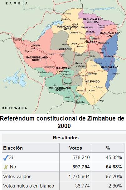 Los días 12 y 13 de febrero de 2000 se celebró en Zimbabwe un referéndum constitucional. La nueva Constitución de Zimbabwe propuesta, que había sido redactada por una Convención Constitucional el año anterior, fue derrotada. La derrota fue inesperada y fue tomada como un rechazo personal para el presidente Robert Mugabe y un triunfo político para el recién formado grupo de oposición, el Movimiento para el Cambio Democrático. La nueva constitución propuesta se destacó por otorgar poder al gobierno para apoderarse de granjas de propiedad de agricultores blancos, sin compensación, y transferirlas a propietarios de granjas negros como parte de un plan de reforma agraria.